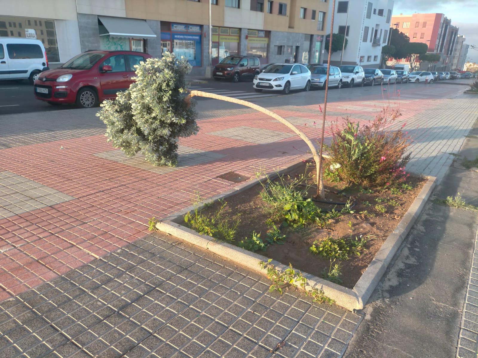 Este es el aspecto que presenta un árbol en la Rambla Pedro Lezcano de Telde. Lleva semanas así, torcido y a punto de partirse mientras ningún responsable de Parques y Jardines del Ayuntamiento ha adoptado solución alguna según denuncian vecinos a ONDAGUANCHE.