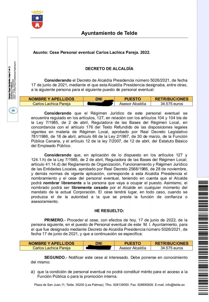 El abogado Carlos La Chica Pareja ha sido cesado de su cargo como asesor municipal del Ayuntamiento de Telde con un Decreto de Alcaldía firmado a las 00:30 horas de este sábado 18 de junio. La Chica Pareja era asesor del concejal de Cultura, Juan Martel, al que ha estado adscrito este cargo de confianza desde el inicio del mandato.