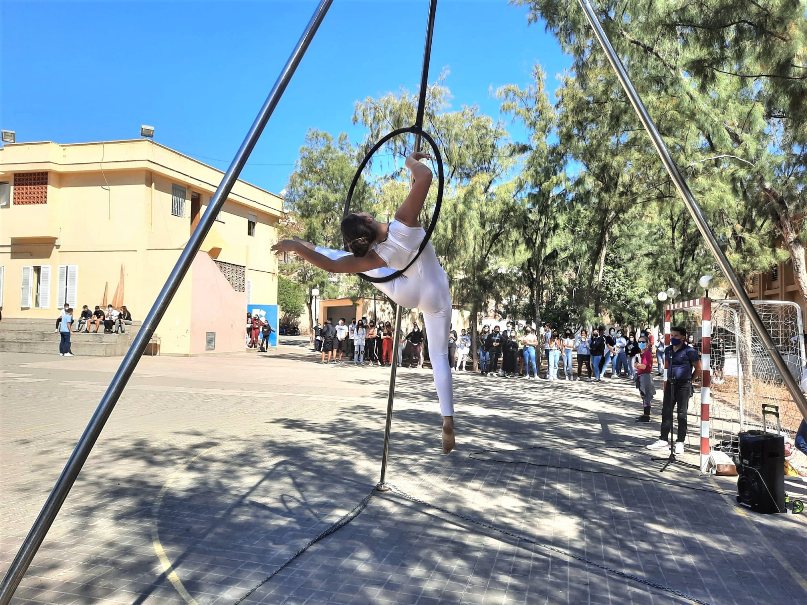 La puesta en escena, que se realizó en una estructura cedida por el Circo Perezoff, contó con dos actuaciones, un número de aro llevado a cabo por la alumna Ana Monzón Peña y otro profesional de sinchas, a cargo de la profesora Norrie Attard.