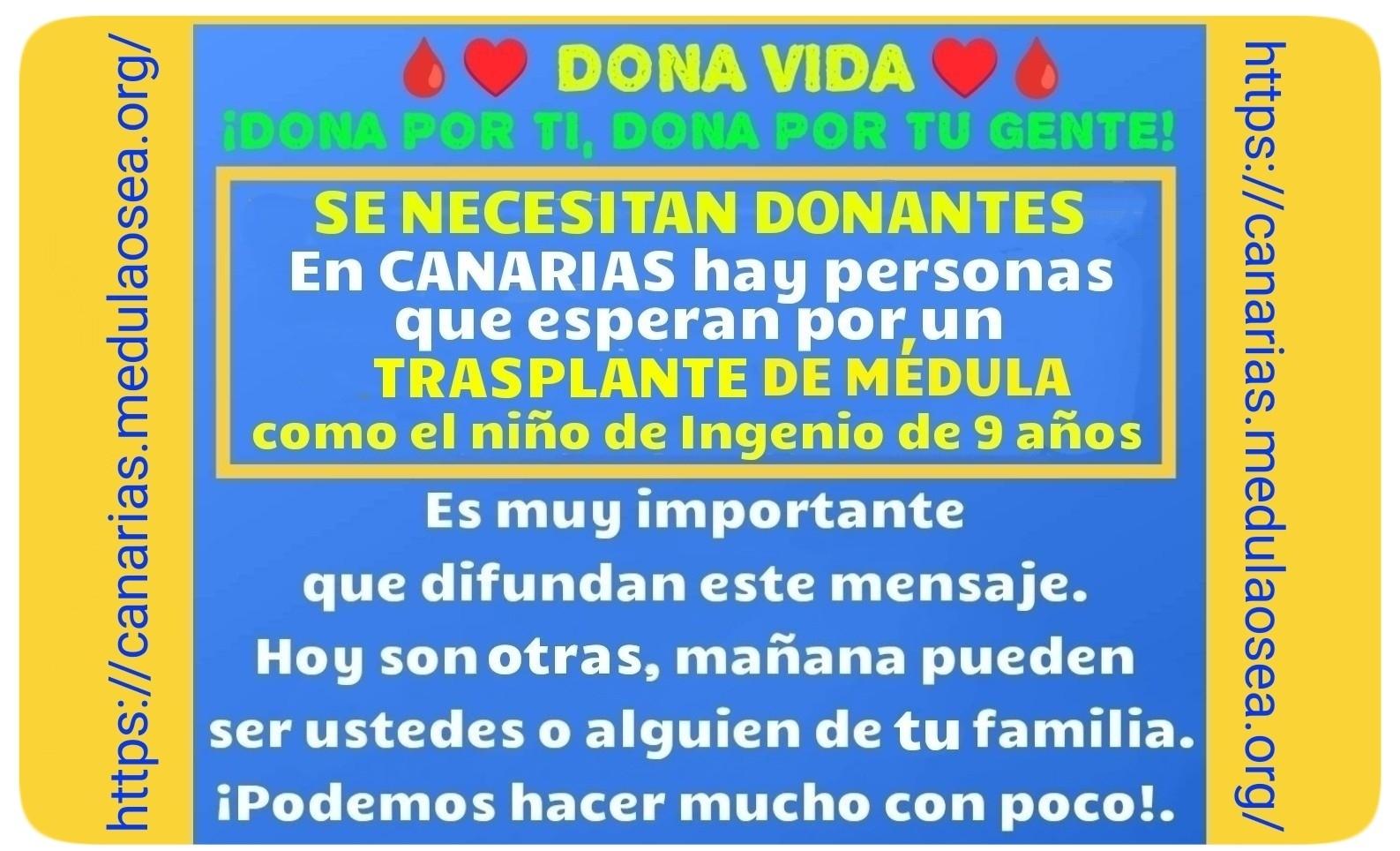 En Canarias hay personas que están esperando por un TRASPLANTE DE MÉDULA. Con una sencilla acción podemos salvar sus vidas, como la del niño de Ingenio de 9 años que le han diagnosticado una aplasia medular, su médula ha dejado de fabricar plaquetas y necesita un trasplante de médula lo más urgente posible.