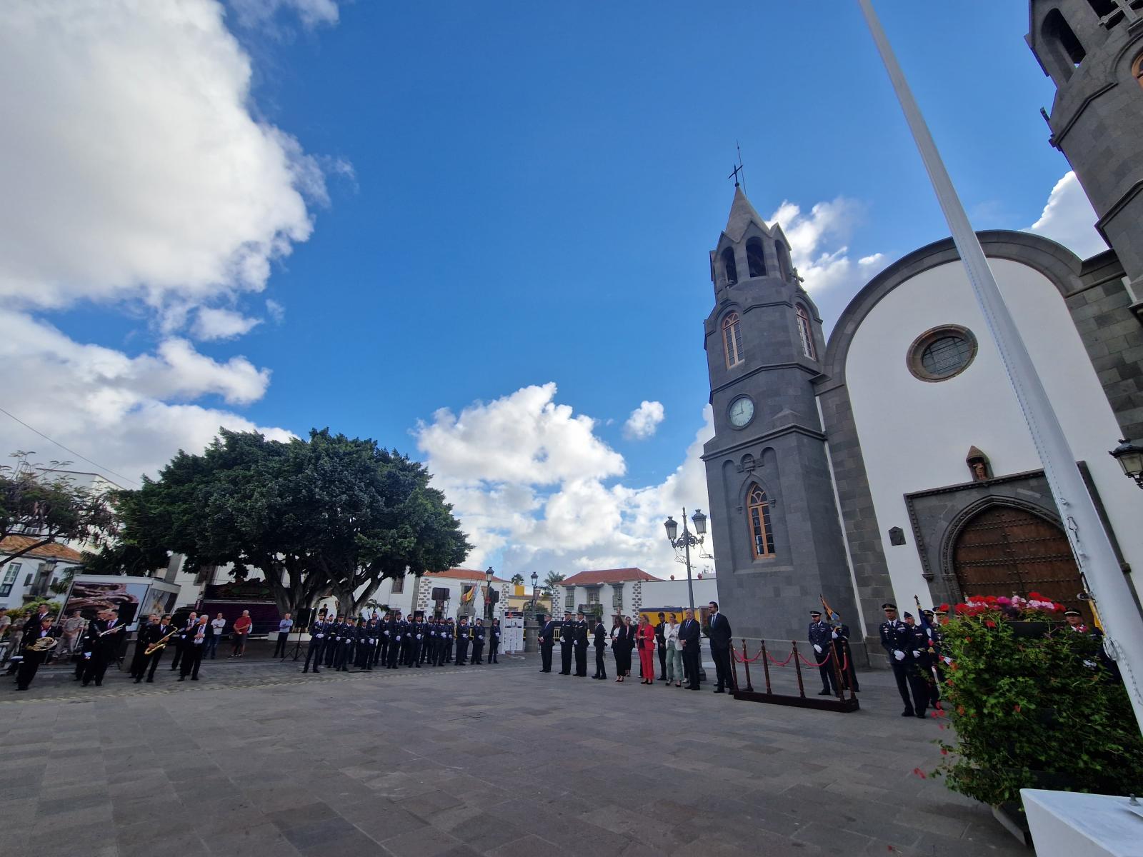 El primer edil fue el encargado de llevar a cabo la acción de izar la bandera, al mismo tiempo que sonaba el himno de España, interpretado por la Banda Municipal de Música de Telde.  El pabellón nacional permanecerá ondeando delante de la Basílica Menor de San Juan hasta las 18.00 horas de este miércoles, momento en el que será retirado, junto al mástil instalado para la ocasión, por el personal militar.