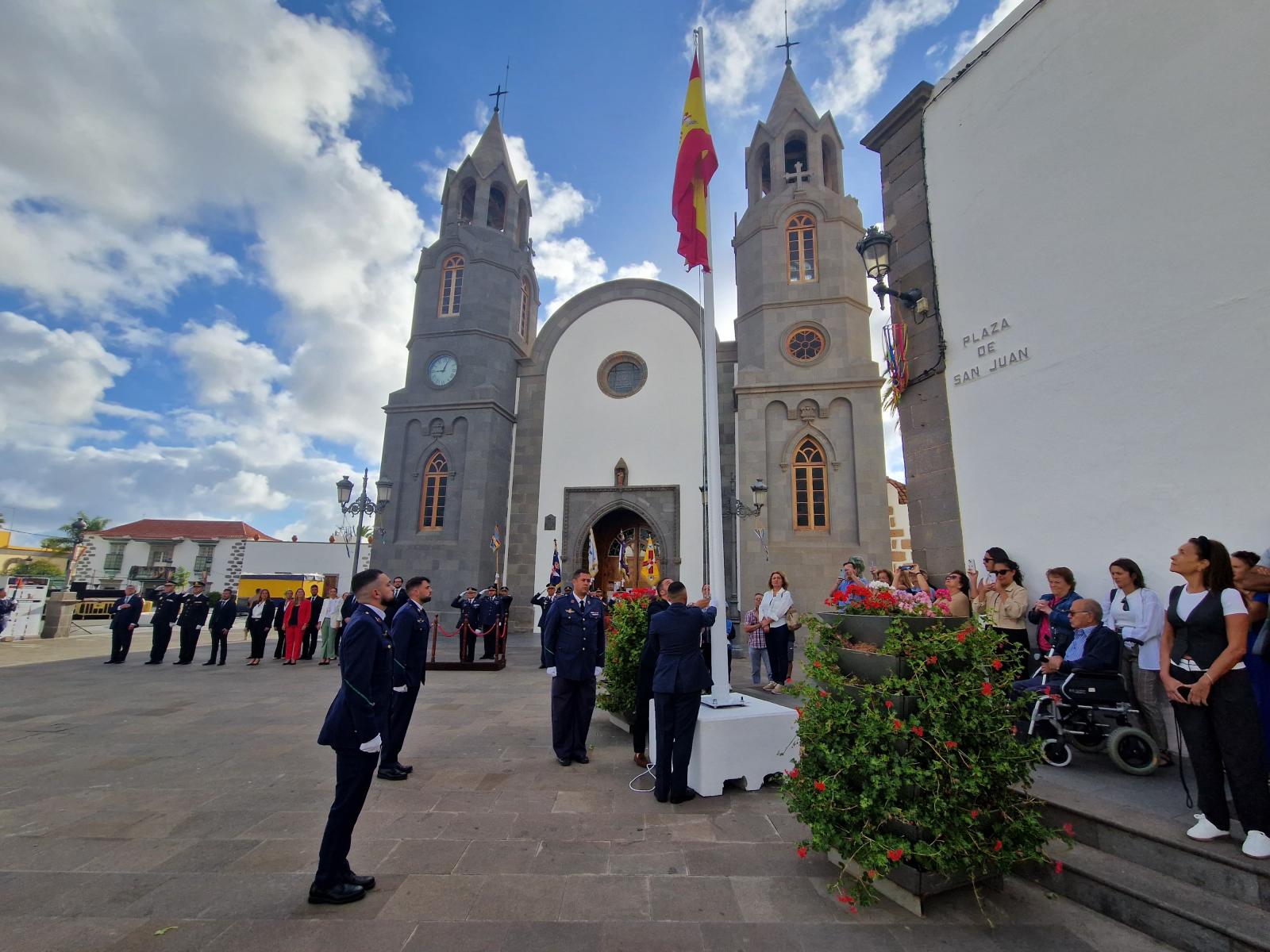 El primer edil fue el encargado de llevar a cabo la acción de izar la bandera, al mismo tiempo que sonaba el himno de España, interpretado por la Banda Municipal de Música de Telde.  El pabellón nacional permanecerá ondeando delante de la Basílica Menor de San Juan hasta las 18.00 horas de este miércoles, momento en el que será retirado, junto al mástil instalado para la ocasión, por el personal militar.