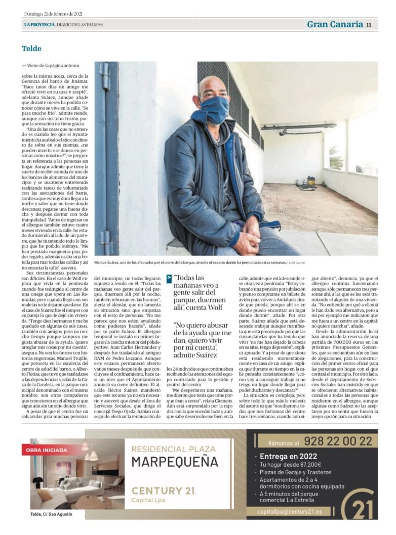 Para las personas que nunca han tenido la mala suerte de pernoctar en la calle, la experiencia resulta inimaginable. Sin embargo, en el municipio de Telde esta es la realidad por la que pasan muchas personas durante semanas, meses e incluso años. La apertura de un centro de acogida en los meses donde incidió con mayor dureza la pandemia salvó de esta situación a más de 60 indigentes, pero tras su repentino cierre, el regreso a las calles ha sido imparable y por lo menos cuatro personas aún no tienen un lugar donde residir.