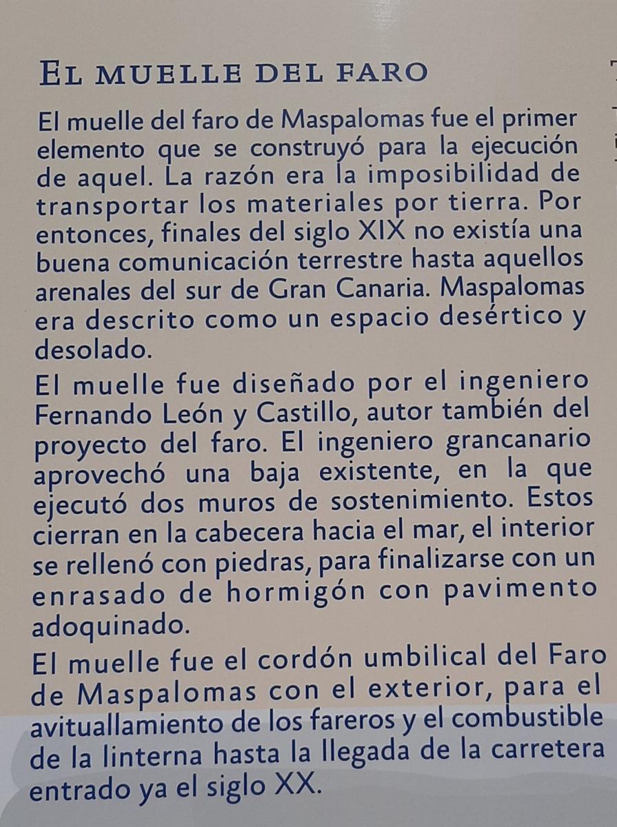 En primer lugar, el Cabildo atribuye tanto el proyecto del Faro de Maspalomas como el diseño del muelle contiguo al abogado y político Fernando León y Castillo, cuando el verdadero autor fue su hermano Juan, prestigioso ingeniero que también impulsó en la isla otras importantes infraestructuras como el Puerto de La Luz o los muelles de Agaete y Sardina.