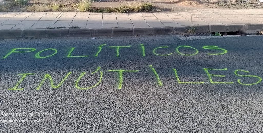 Este sábado amanecía con pintadas en la zona con insultos como «Políticos inútiles» y «Vergüenza», exigiendo al gobierno de Telde cuyo presidente es Juan Antonio Peña, tomar este asunto como algo prioritario ya que es una situación elevadamente peligrosa para la integridad de miles de ciudadanos, usuarios del parque empresarial de Salinetas y la propia responsabilidad del ayuntamiento, ante las múltiples demandas patrimoniales que se pueden exigir por parte de la ciudadanía.