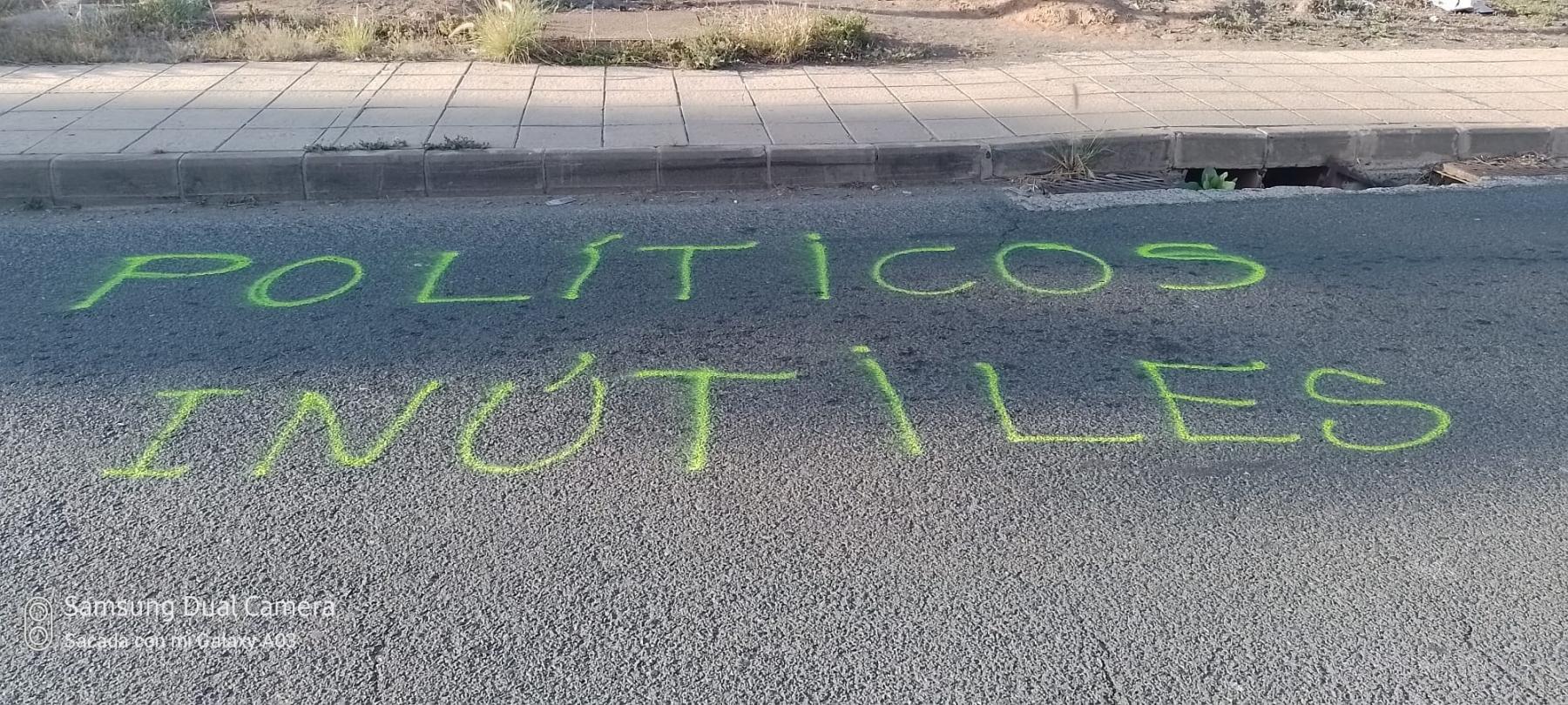 EL PUEBLO SE CANSA DE LAS MENTIRAS PARA ASFALTAR EL ACCESO A SALINETAS DESDE LA GC-1 Y APARECEN PINTADAS EN LA ZONA: «POLÍTICOS INÚTILES»