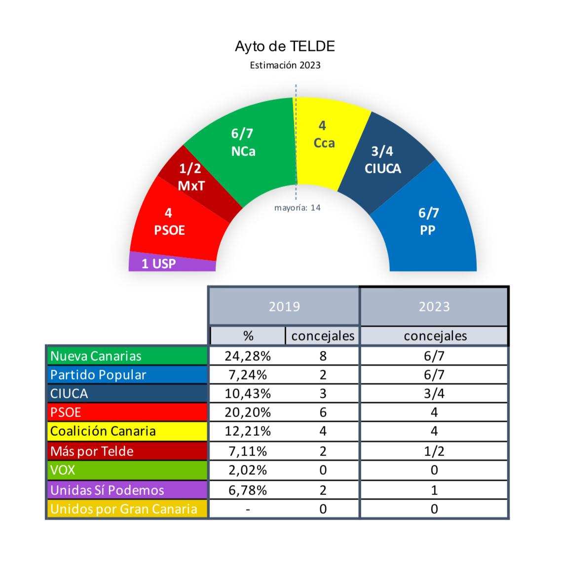 Estos guarismos impedirían reeditar la actual alianza ya que el reparto de fuerzas dejaría lejos de la mayoría absoluta (14) a la alianza que forma actualmente el gobierno en el municipio grancanario -la suma de NC, CC y Más por Telde no alcanza-, lo que obligaría a ampliar o cerrar nuevos pactos para dirigir el consistorio.