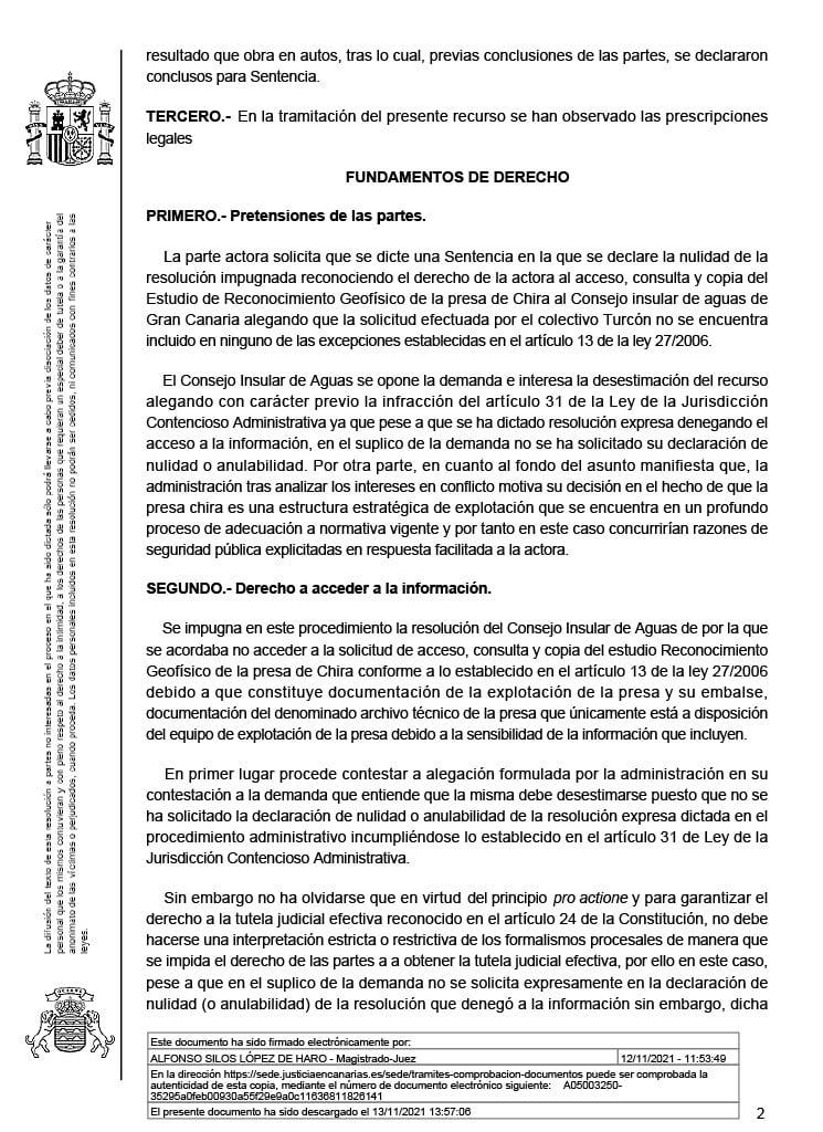 Honorio Galindo Rocha, presidente de Turcón, señaló a ONDA GUANCHE que «el Cabildo negaba la solicitud de acceso, consulta y copia del estudio Reconocimiento Geofísico de la presa de Chira conforme a lo establecido en el articulo 13 de la ley 27/2006 argumentando que constituye documentación de la explotación de la presa y su embalse, documentación del denominado archivo técnico de la presa que únicamente está a disposición del equipo de explotación de la presa debido a la sensibilidad de la información que incluyen. Al admitirlo a trámite el mismo se acordó reclamar el expediente correspondiente».