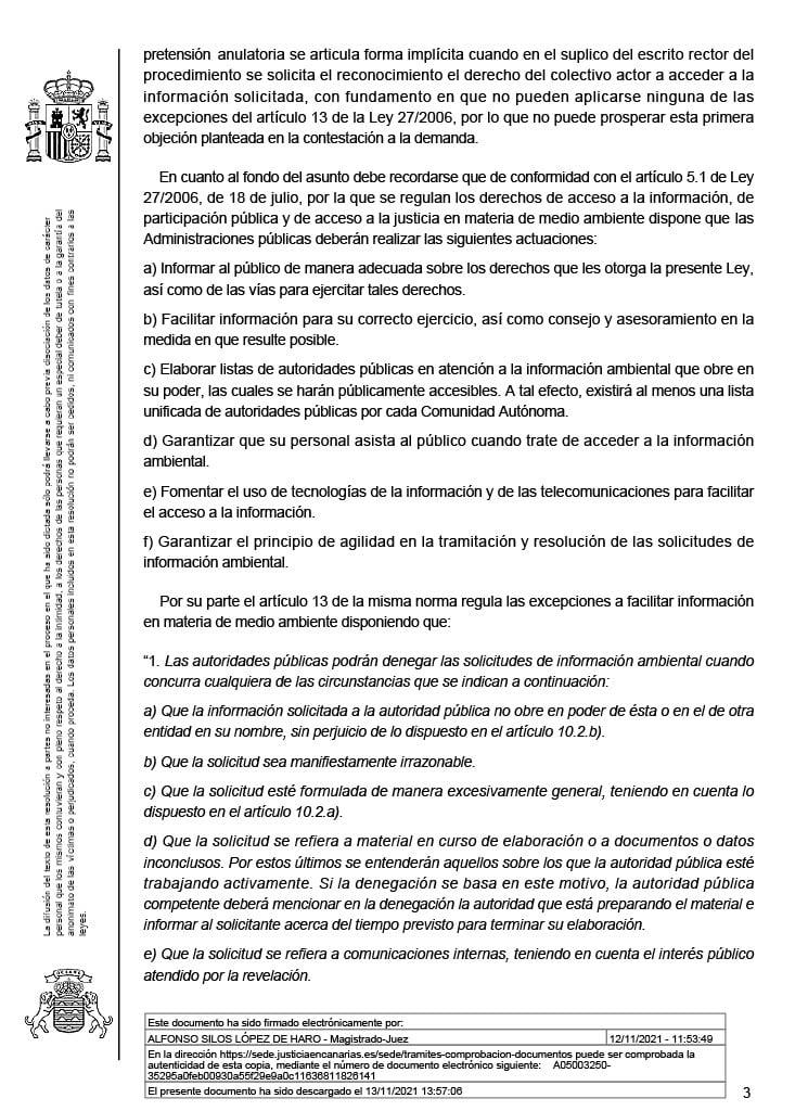 Sin embargo, gracias a la denuncia de Turcón, «una vez mas y en aplicación de la Ley 27/2006 que regula el acceso a información de carácter medioambiental, supone poder disponer de la información que resulte de interés para los colectivos ambientalistas y que está en manos de la administración y que en muchos casos se niega la entrega por parte de técnicos, funcionarios, etc. Quizás en algún caso por orden política», indicó Honorio.