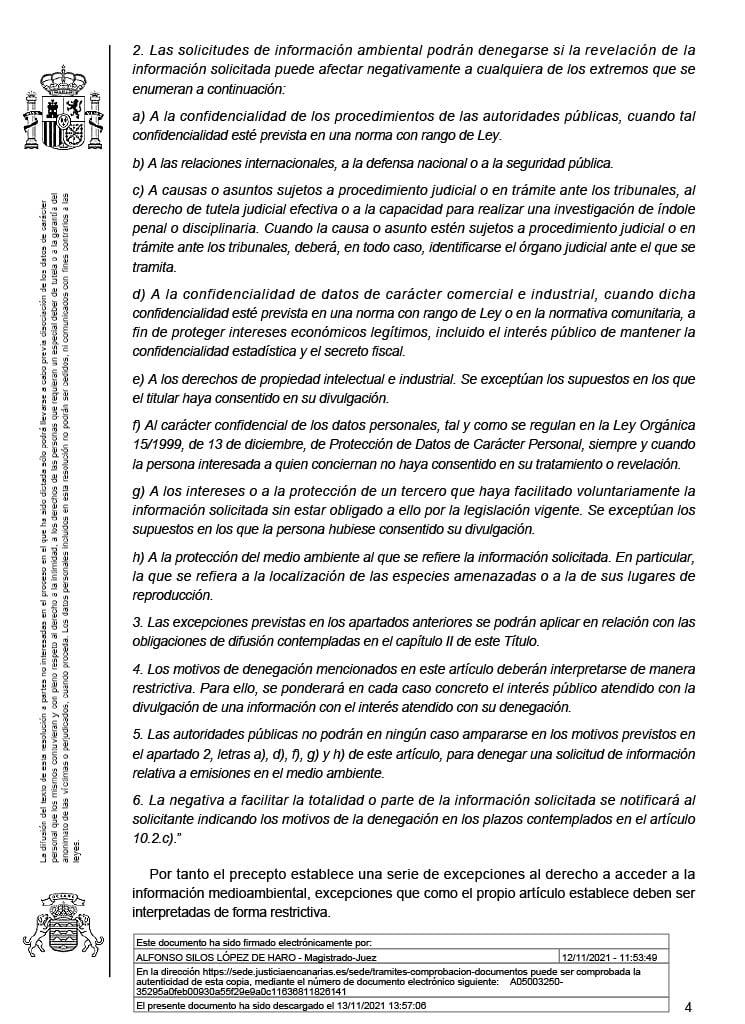 Sin embargo, gracias a la denuncia de Turcón, «una vez mas y en aplicación de la Ley 27/2006 que regula el acceso a información de carácter medioambiental, supone poder disponer de la información que resulte de interés para los colectivos ambientalistas y que está en manos de la administración y que en muchos casos se niega la entrega por parte de técnicos, funcionarios, etc. Quizás en algún caso por orden política», indicó Honorio.