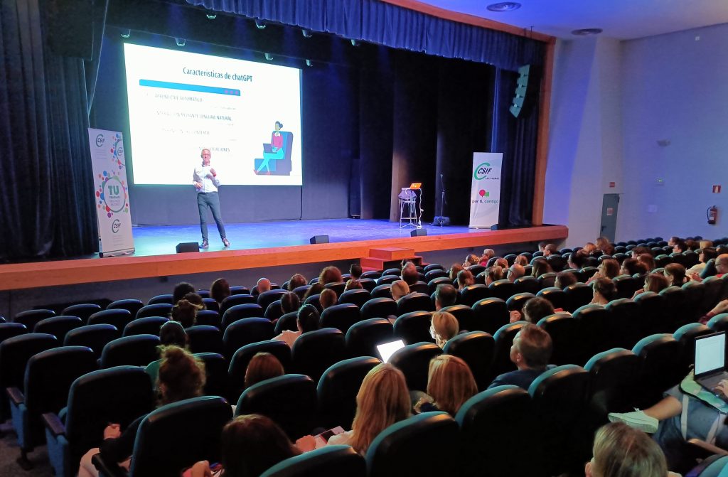 Más de 180 docentes de la isla de Gran Canaria participaron de manera presencial y activa en esta atractiva formación impartida por el docente en activo. D. Fernando Posada Prieto y experto en tecnologías educativas de aplicación en el sector docente. El objetivo de esta formación era la de conocer y utilizar las posibilidades que ofrece la Inteligencia Artificial a través de chatGPT como chatbot generativo para facilitar la elaboración de recursos y materiales por parte del docente en distintas áreas y niveles.