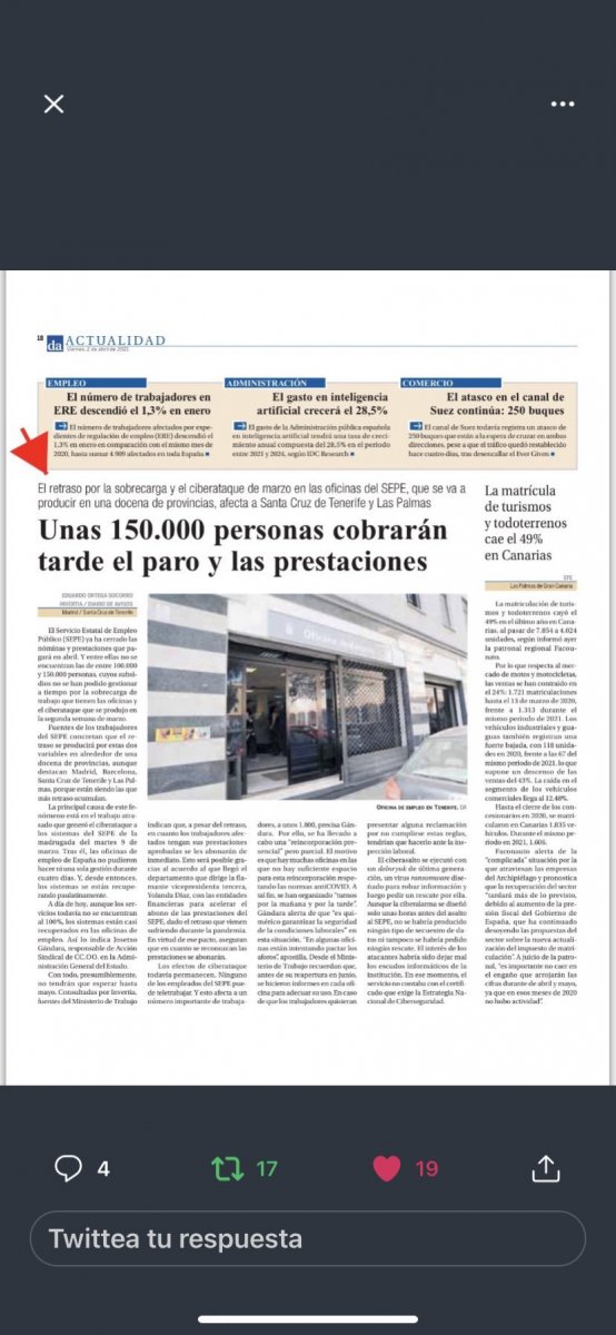 Gloria Cabrera, consejera del grupo CC-UxGC en el Cabildo de Gran Canaria se pregunta tras la publicación del periódico ‘Diario de Avisos’ de la información titulada “La falta de más dosis deja a Canarias en el vagón de cola de la vacunación”: “¿Algún canario/a puede seguir creyendo que lo mejor para Canarias son estos/as del ‘pacto de las flores’? Estamos y nos conducen a la más absoluta deriva y consecuente miseria”, señaló la política teldense.