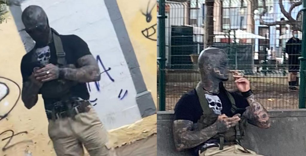 De esta guisa se pasea varios días a la semana un sujeto por la popular calle Triana de Las Palmas de Gran Canaria. La cantidad de tatuajes que luce hace que junto a su peculiar indumentaria, sea imperceptible el color natural de la piel. Con nariz y orejas operadas hasta casi desaparecer, no es de extrañar que más de uno al verlo se pregunte: ¿Es humano o reptil?