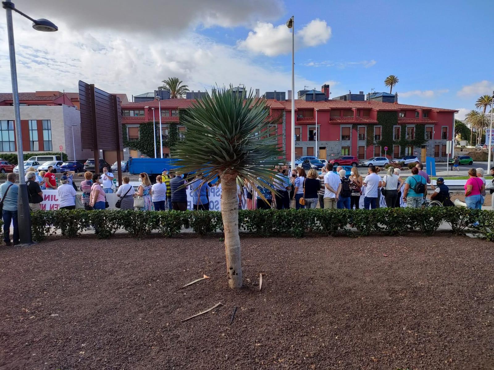 Unos cien vecinos de Jinámar se manifiesta desde hace unos minutos delante de las puertas del nuevo edifico administrativo del Ayuntamiento de Telde en El Cubillo reivindicando mejores servicios para el barrio.