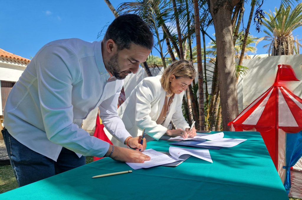 Juan Antonio Peña, alcalde de Telde y María Méndez, administradora general de Radiotelevisión Canaria, se reunieron en la mañana de este miércoles en el parque de Santa Rosalía, en San Juan, para firmar el convenio que hará posible la retransmisión en directo de la Gala Drag Queen del Carnaval de Telde 2024, que tendrá lugar el viernes 8 de marzo en el auditorio José Vélez.