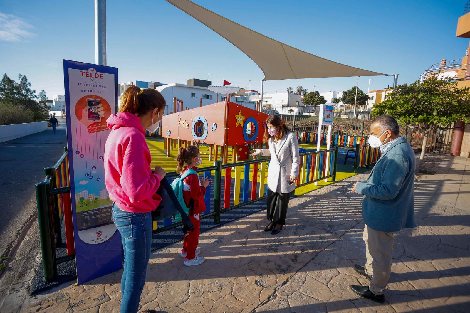 La alcaldesa de Telde, Carmen Hernández, y el concejal de Parques y Jardines, Álvaro Monzón, visitaron este viernes el parque infantil de La Garita donde ya se culminaron las obras de renovación con nuevos juegos y un pavimento continuo de llamativos colores, al igual que los bancos, y está ya disponible para el disfrute de la ciudadanía.