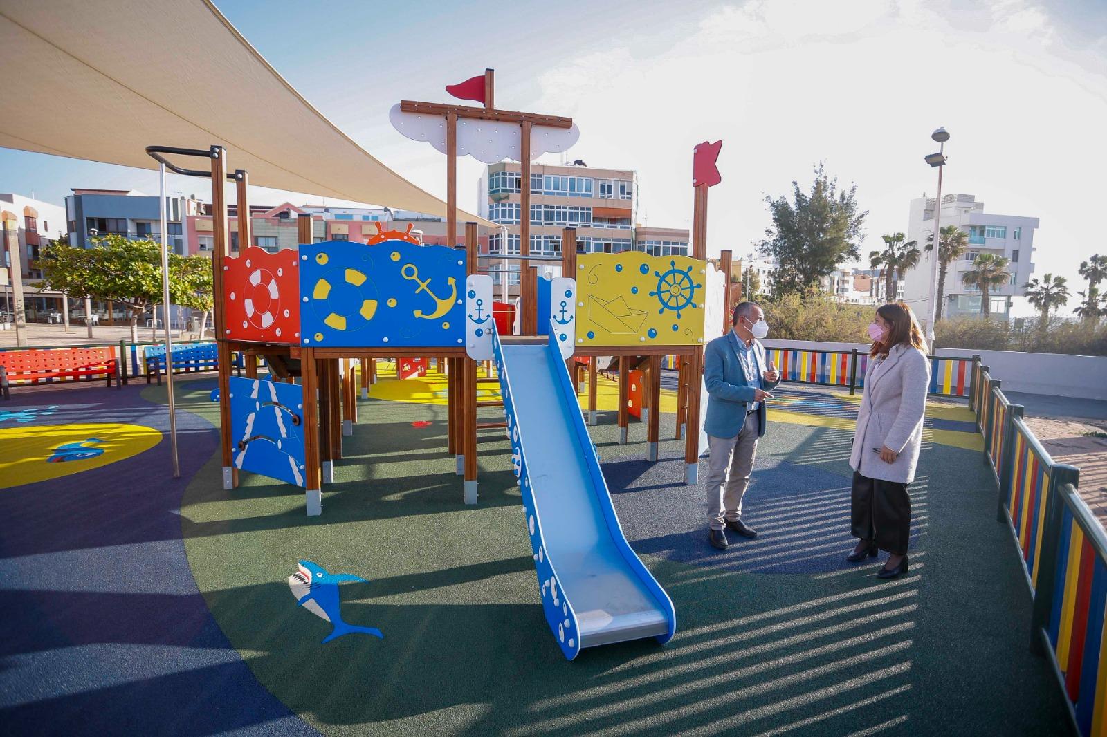 La alcaldesa de Telde, Carmen Hernández, y el concejal de Parques y Jardines, Álvaro Monzón, visitaron este viernes el parque infantil de La Garita donde ya se culminaron las obras de renovación con nuevos juegos y un pavimento continuo de llamativos colores, al igual que los bancos, y está ya disponible para el disfrute de la ciudadanía.