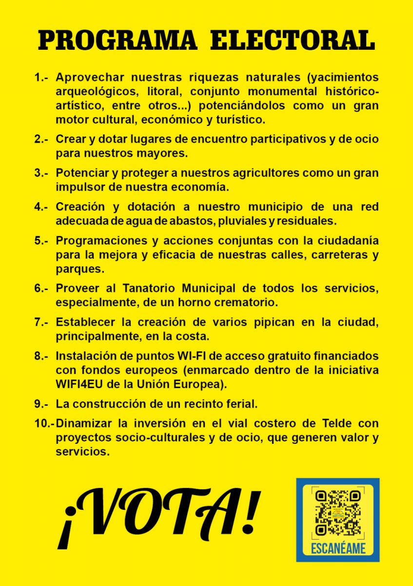 Es por ello, por las necesidades de nuestros barrios y nuestras ganas de mejorarlos, por lo que me presento a las elecciones municipales y les pido y les animo a que el próximo veintiocho de mayo depositen sus votos a nuestra candidatura para, entre todos, conseguir lo que he suscrito y además mejorar la ciudad de Telde y la calidad de vida de los teldenses.