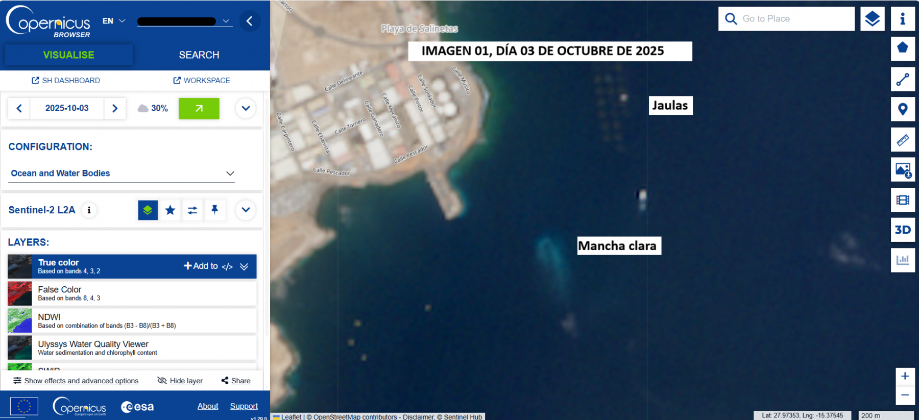 La zona corresponde al dique de Salinetas, gestionado por Puertos del Estado, y a la zona costera adyacente. Se aprecia una mancha blanquecina al sureste del dique, y también se ven las jaulas de la piscifactoría denominada “Melenara II”, de Aquanaria, SL, así como lo que parecen ser uno o dos barcos, al sur de la piscifactoría.