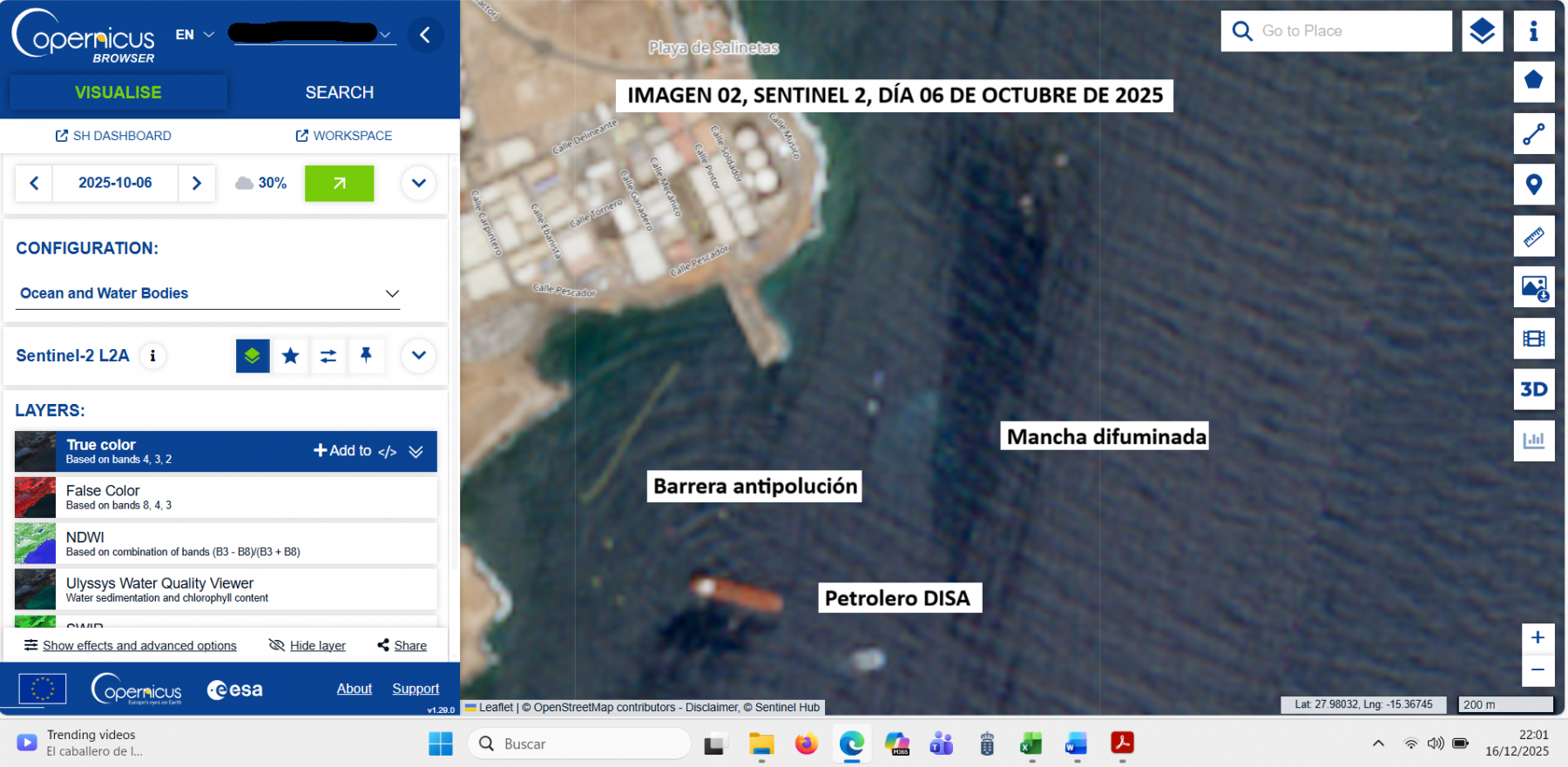 En la IMAGEN 5 hemos vuelto a la primera imagen de los satélites Sentinel del día 03 de octubre, y utilizando la herramienta de medición de distancias que incorpora, medimos la distancia entre la mancha blanca y el litoral.