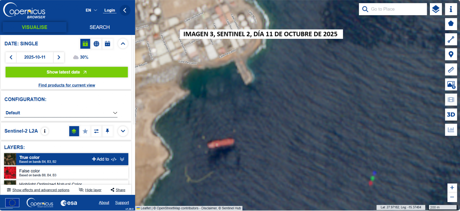 El 11 de octubre ya no se aprecia mancha alguna y hay otro pequeño petrolero con la barrera anti polución situada al suroeste del barco (IMAGEN 3).