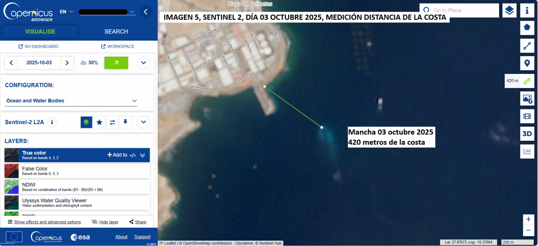 En la IMAGEN 5 hemos vuelto a la primera imagen de los satélites Sentinel del día 03 de octubre, y utilizando la herramienta de medición de distancias que incorpora, medimos la distancia entre la mancha blanca y el litoral.