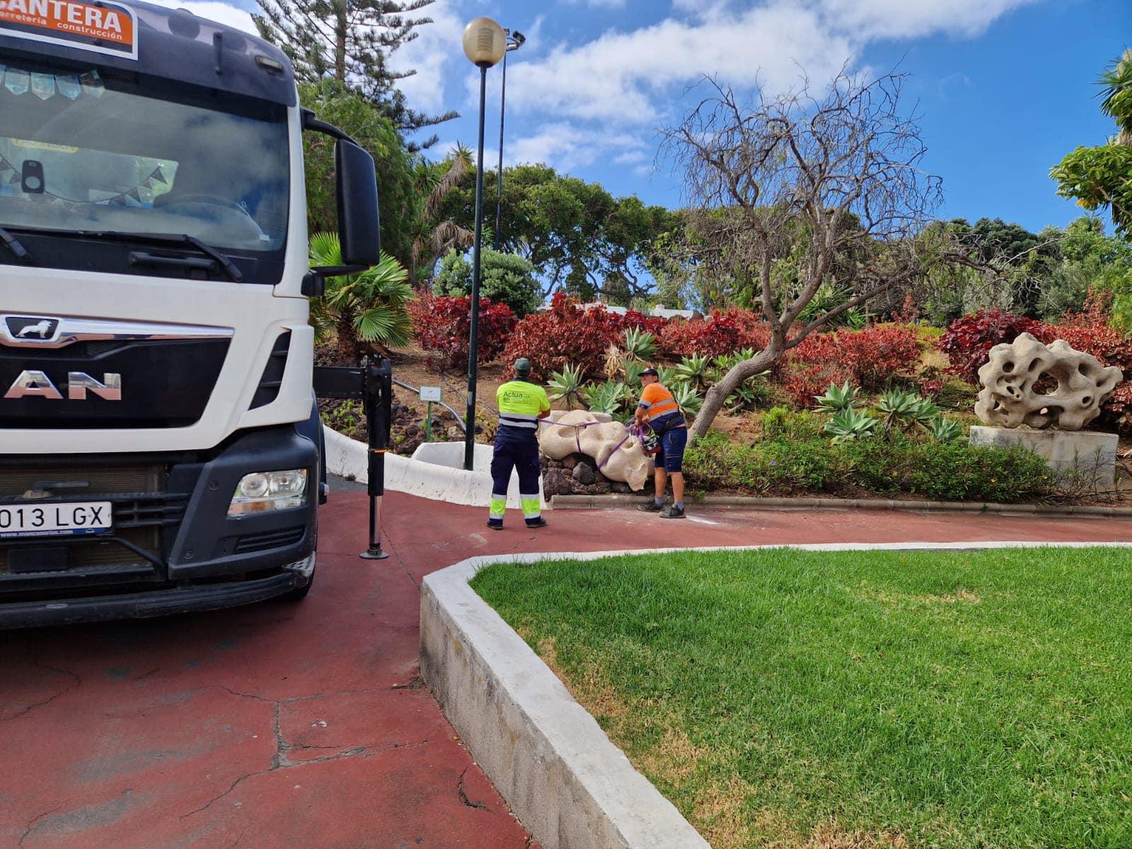 Una de las obras más importantes del teldense Plácido Fleitas, ubicada en el parque de San Juan, ha sido sufrido importantes desperfectos por el vandalismo. El concejal de Parques y Jardines, Juan Francisco Artiles, trabaja desde primera hora de este sábado, par retirar y ya programar su rehabilitación. La Policía Local, junto a la Policía Nacional, investiga los hechos ocurridos.