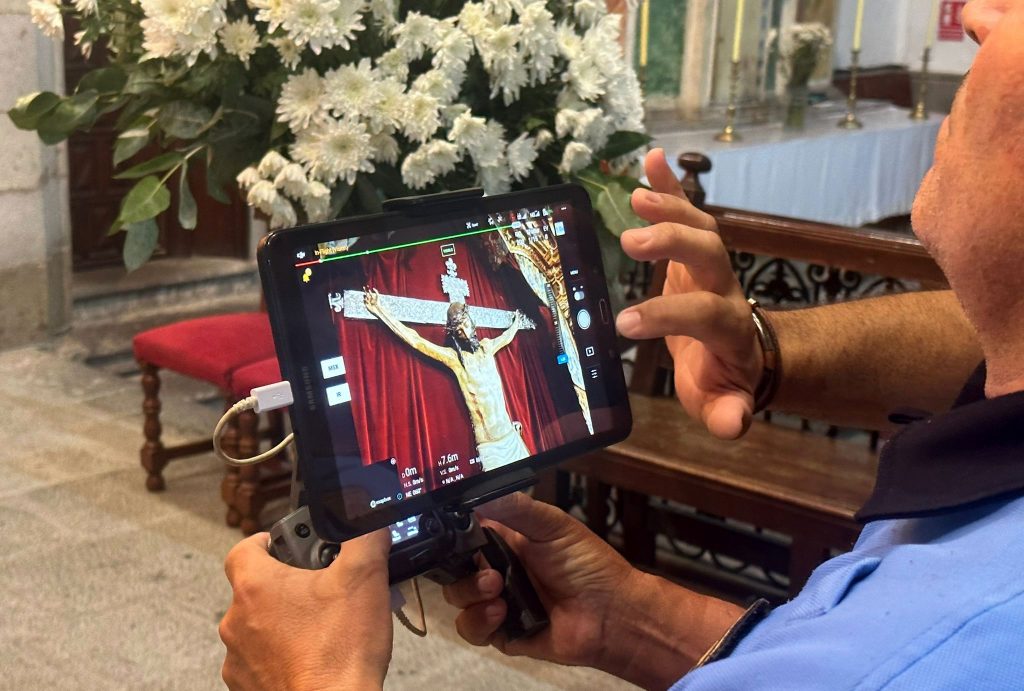 Ni la iglesia ni la institución local contaban en su archivo con capturas de calidad del Cristo de Telde para reproducirse a escala de 1,78 x 1,20 metros -medidas de la imagen que lucirá la carreta-, por lo que se buscó la forma de inmortalizarla sin necesidad de bajarla de la hornacina. Así, se decidió contar con Unidron para despegar el dispositivo y acercar su cámara a la histórica talla. Cabe destacar que, antes de obtener el fotograma, voluntarios de la iglesia se subieron al Altar Mayor para limpiar la imagen y colocarle las potencias.