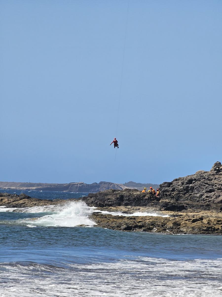 Mientras el equipo de salvamento y socorrismo, con lanchas y motos acuáticas, llevó a cabo su labor en el agua, para salvar a varios supuestos pescadores que se habían resbalado desde las rocas en la playa, un helicóptero los rescató desde el cielo para que, a continuación, el equipo preparado desde la arena realizara las correspondientes técnicas de reanimación, ante la mirada incrédula del público. Un espectáculo reflejo de la importante labor que cada día llevan a cabo estos hombres y mujeres que arriesgan sus vidas para velar por la seguridad y salvaguarda de los usuarios.