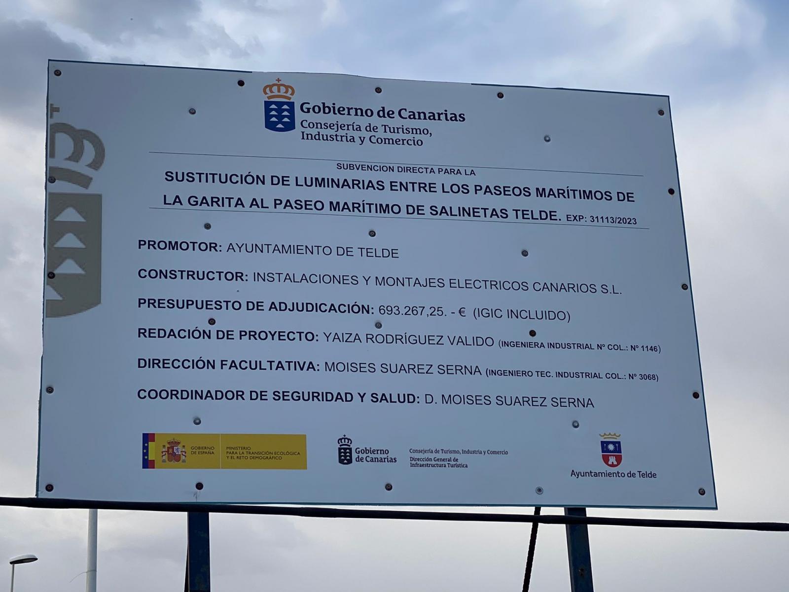 La renovación, con cargo a una subvención del Gobierno regional concedida en 2018 y que estaba a punto de expirar, arrancó en noviembre. El proyecto, que ejecuta la empresa Instalaciones y Montajes Eléctricos Canarios por 693.267,25 euros, a los que hay que sumarle otros 6.000 euros para la dirección de obra, contempla la sustitución de 400 puntos de luz entre La Garita y Salinetas. El Ayuntamiento de Telde declaró la obra de emergencia debido al grave peligro de caída y accidentes por electrocución que existe.