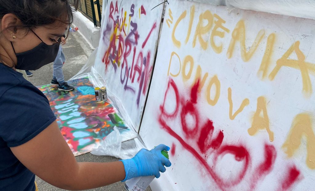 El alumnado del CEIP Poeta Montiano Placeres están decorando las paredes de su colegio con los graffitis que han realizado en una de las actividades organizadas por el Plan Integral del Valle de Jinámar conjuntamente con la asociación Mojo de Caña.