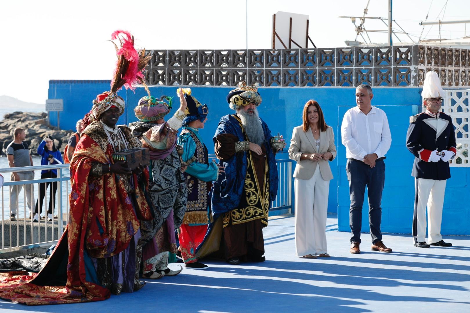 Los Reyes Magos de Oriente llegaron este jueves por la mañana a Telde a bordo de un barco que atracó en el muelle de Taliarte, donde fueron recibidos por la alcaldesa, Carmen Hernández, y el concejal de Festejos, Servando González, al son de la música de la Banda Municipal de Música. Melchor, Gaspar y Baltasar, acompañados de sus pajes reales, saludaron a los niños y niñas que les esperaban en el recinto portuario y seguidamente partieron en coches antiguos a visitar a los mayores de la Residencia de Taliarte.