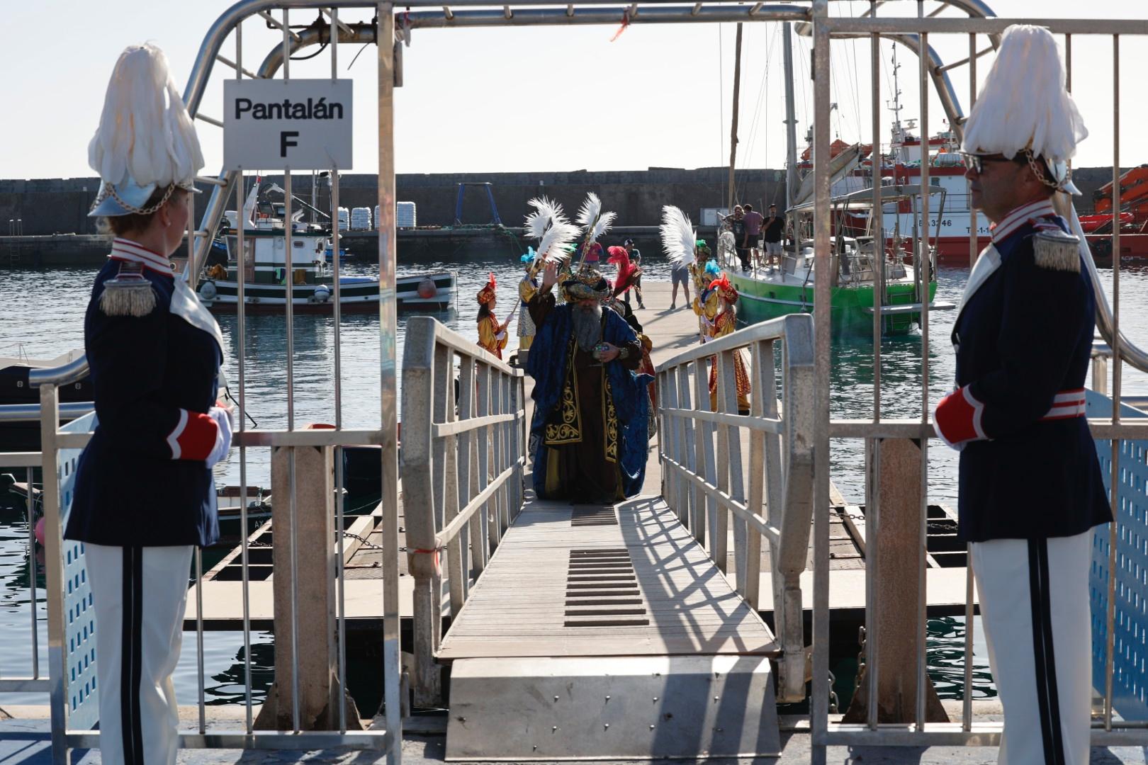 Los Reyes Magos de Oriente llegaron este jueves por la mañana a Telde a bordo de un barco que atracó en el muelle de Taliarte, donde fueron recibidos por la alcaldesa, Carmen Hernández, y el concejal de Festejos, Servando González, al son de la música de la Banda Municipal de Música. Melchor, Gaspar y Baltasar, acompañados de sus pajes reales, saludaron a los niños y niñas que les esperaban en el recinto portuario y seguidamente partieron en coches antiguos a visitar a los mayores de la Residencia de Taliarte.