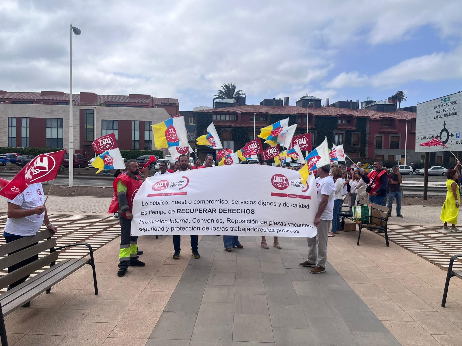 UGT con el apoyo de Intersindical Canaria llevó a cabo este miércoles la primera de las concentraciones frente al Ayuntamiento de Telde convocada para reclamar la recuperación de ciertos derechos laborales que los trabajadores municipales han visto recortados en los últimos años.