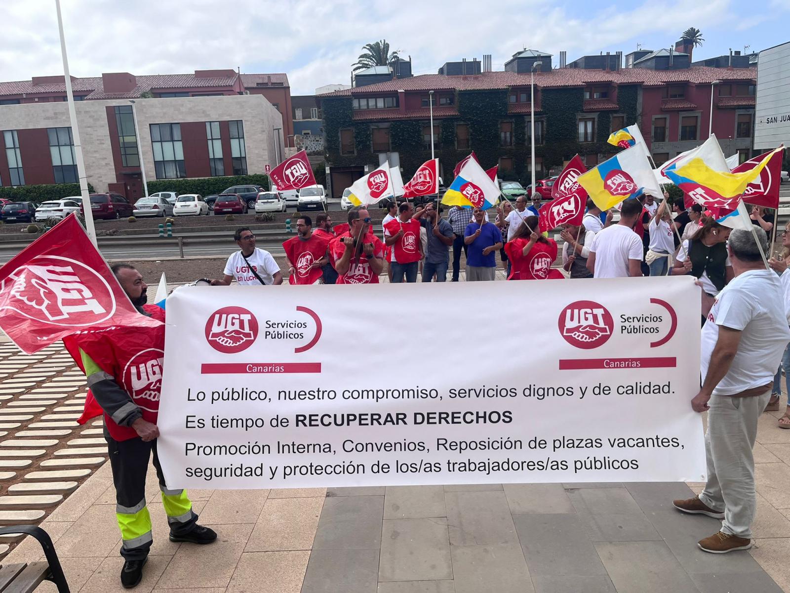 UGT con el apoyo de Intersindical Canaria llevó a cabo este miércoles la primera de las concentraciones frente al Ayuntamiento de Telde convocada para reclamar la recuperación de ciertos derechos laborales que los trabajadores municipales han visto recortados en los últimos años.