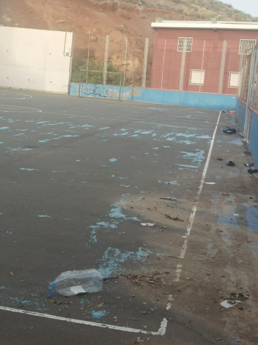 Denuncian que los ‘menas’ que están en Montaña Las Palmas han dejado un colchón, playeras rotas hacen sus necesidades dentro de la cancha y han pintado con spray todo el perímetro. Se trata de la cancha que utiliza el colegio para niños de 4 a 12 años para su clase de educación física. Aparte no hay luz, las rejas están rotas y nadie mira por eso.