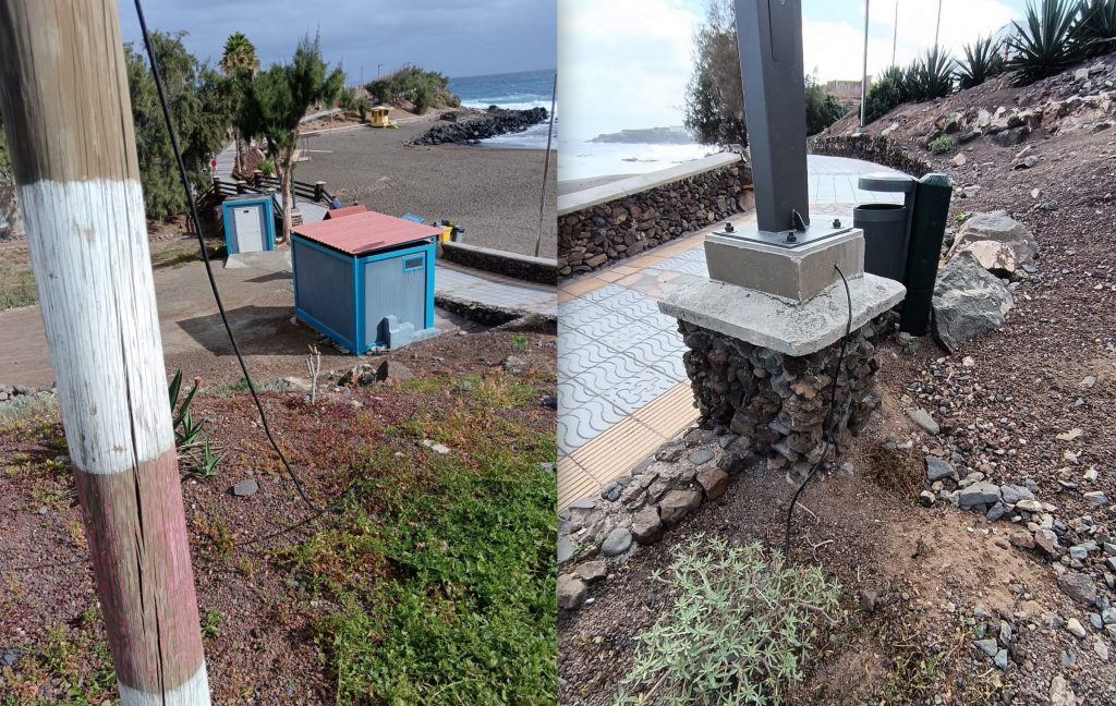 Los trabajos de instalación de las nuevas luminarias que alumbrarán el paseo costero de Telde continúan presentando graves anomalías como informó ONDAGUANCHE hace unos días. Hoy conocemos que en la playa de Hoya del Pozo la empresa contratada por el Ayuntamiento de Telde para tal tarea, retiró el tendido eléctrico que alimentaba un poste con focos cerca del aparcamiento que habitualmente utilizan las caravanas que van al lugar dejando tirados los cables por el suelo a tan solo metros del paseo con el consiguiente riesgo de electrocución o tropiezo para los transeúntes.
