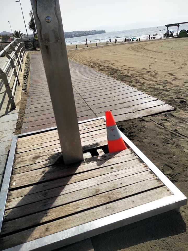 Detallábamos el estado lamentable de las duchas y lavapiés, que ocasionan  inseguridad para los usuarios, así como el deteriorado estado de las pasarelas de accesibilidad a las mismas.