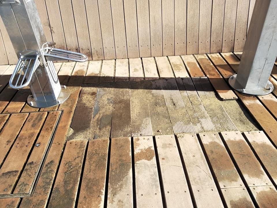 Detallábamos el estado lamentable de las duchas y lavapiés, que ocasionan  inseguridad para los usuarios, así como el deteriorado estado de las pasarelas de accesibilidad a las mismas.