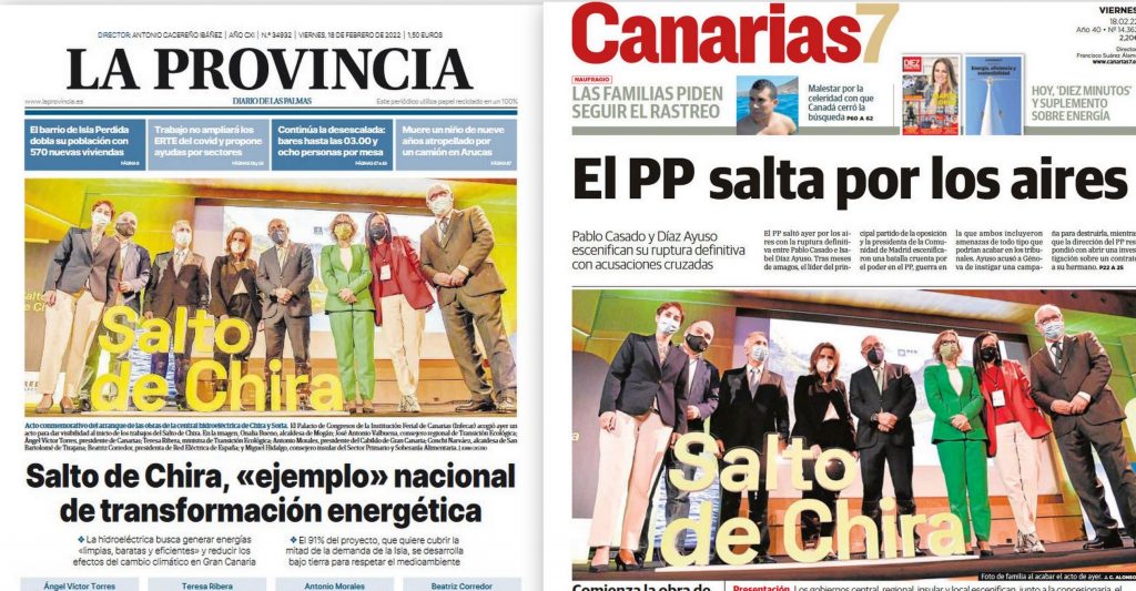 Con solo poner juntas las dos portadas de hoy de las dos cabeceras más leídas de Gran Canaria (abajo), resulta evidente que el periodismo en la isla se ha puesto al servicio de la caja registradora del Cabildo. Ambos periódicos ni siquiera se molestan en utilizar un grafismo propio, sino que copian y pegan burdamente en sus respectivas portadas el material propagandístico que les envía el Cabildo de Gran Canaria, máximo benefactor de ambos rotativos. Desde luego, habrá un antes y un después de Chira-Soria, pero mucho me temo que el cambio no va a ser para mejor y mucho menos relacionado con la energía. Estoy hablando, por supuesto, de calidad democrática.