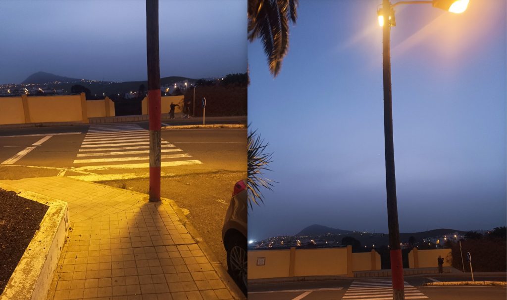 Si se fijan, digo que está iluminado a “medias” porque el foco ilumina más la acera que está junto a la gasolinera Disa que la de enfrente, que también tiene su importancia y está, como se puede ver, en penumbra.