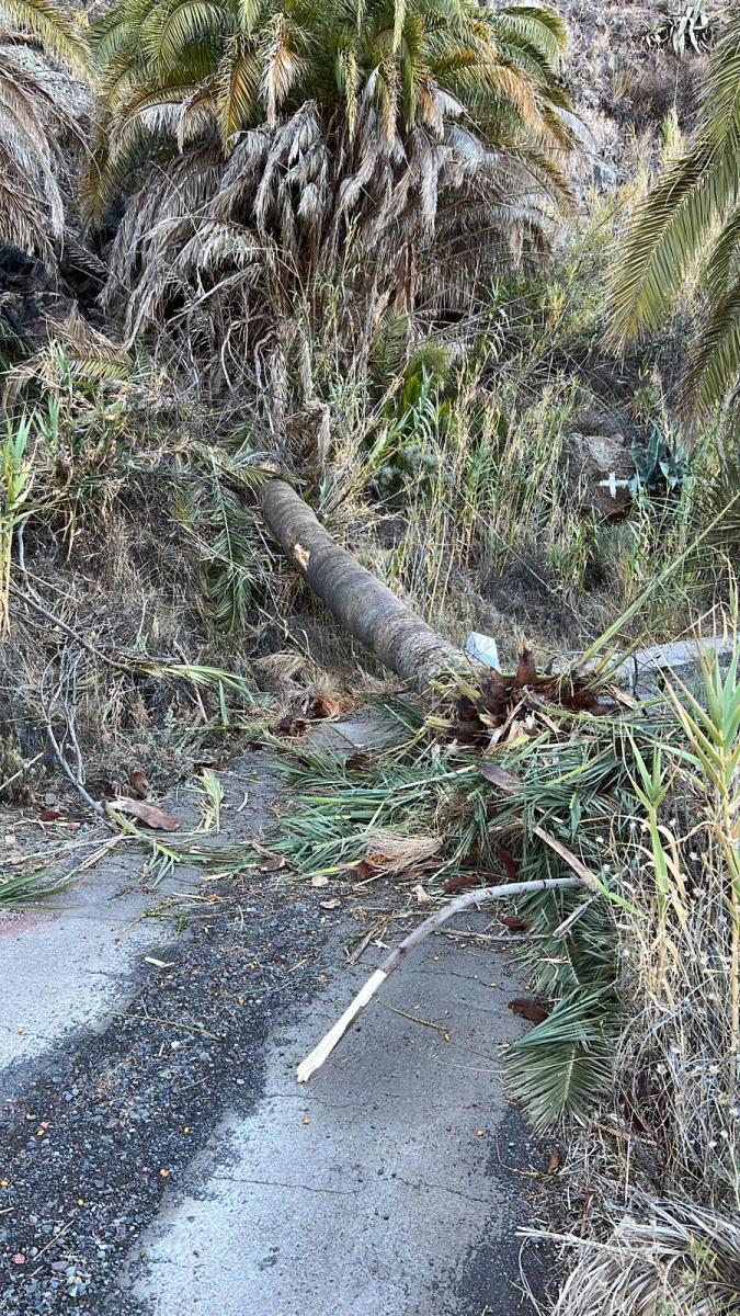 También se encuentra cortada la carretera que llega hacia el molino por la caída de unas palmeras y vehículo abandonado que se encuentra detrás de estas .