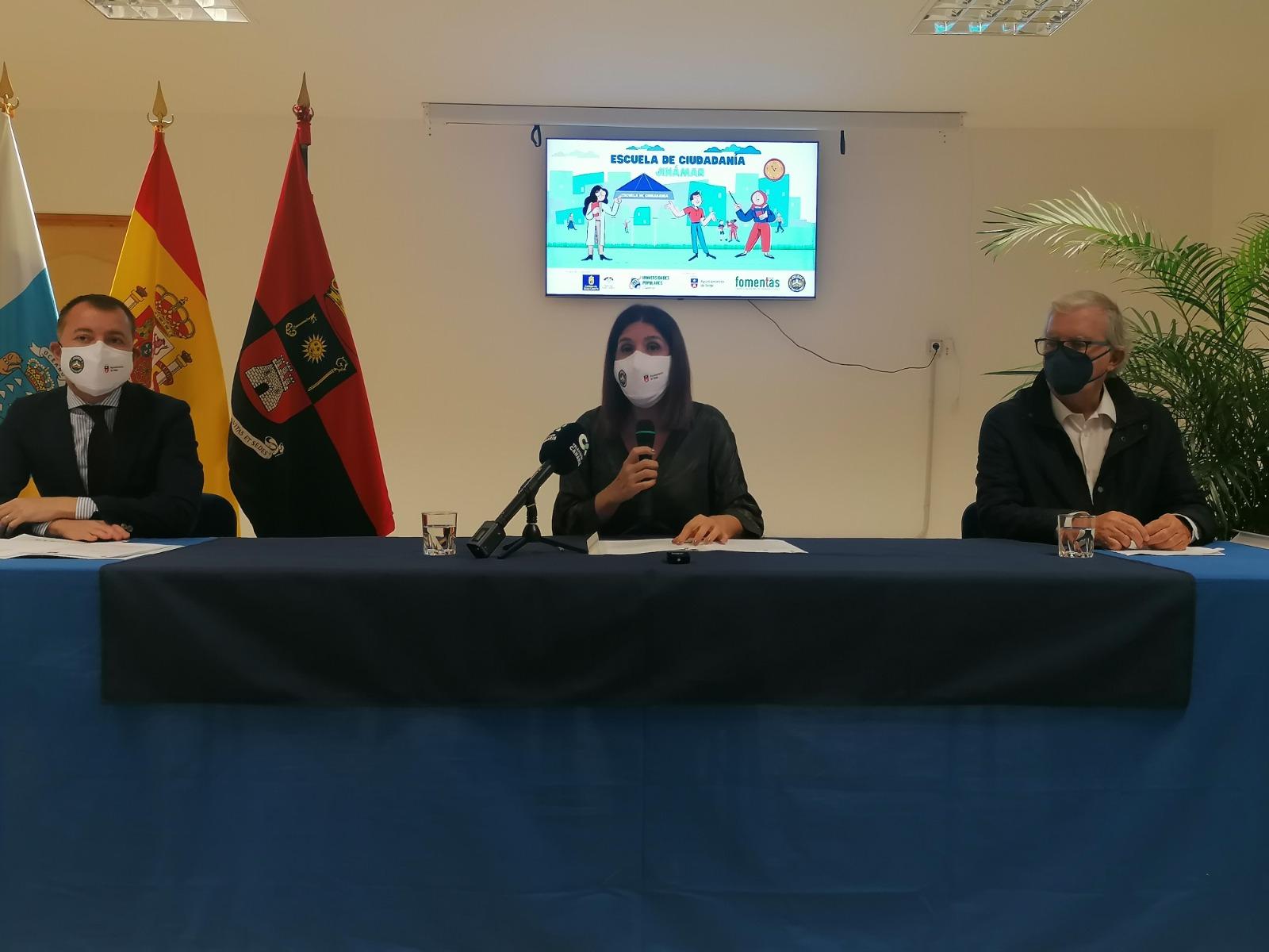 La Escuela de Ciudadanía fomentará en Jinámar la participación activa de los vecinos y de los colectivos en la actividad pública, sumándose así a los recursos socioeducativos con los que cuenta este barrio teldense. La alcaldesa, Carmen Hernández, el consejero de Presidencia, Teodoro Sosa, el responsable de Relaciones Institucionales de la Asociación Canaria de Universidades Populares, José Luis López, y el director insular de Participación Ciudadana, Jorge Artiles, presentaron esta iniciativa impulsada por el Cabildo grancanario y la Universidad Popular de Jinámar, en colaboración con el Ayuntamiento de Telde.