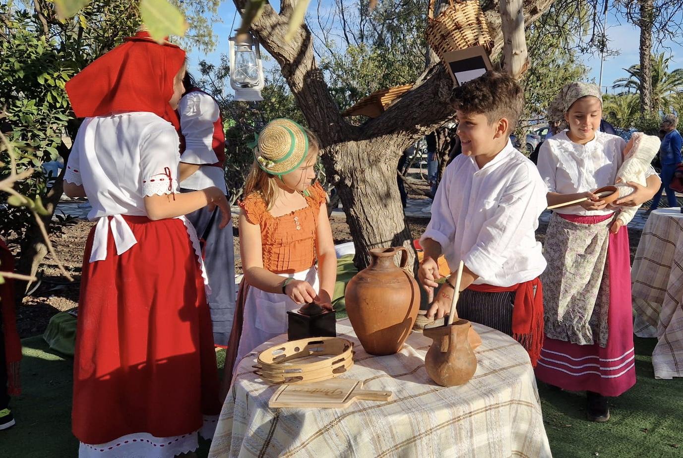 En la quesería vimos elaborar queso en directo, en la panadería los participantes terminaron de harina hasta en los ojos, las costureras tejían al sol, lo mismo que los agricultores araban la tierra junto a los alfareros y su arcilla. En el mercadillo, frutas y verduras y nuestro puesto de FUNDEO con las manualidades que se habían realizado en el taller. No faltó una enorme vaca con su ternero recién nacido y unas ovejas paseando entre la gente que hicieron las delicias de los más pequeños, que ya habían actuado cantando unos preciosos y animados villancicos.