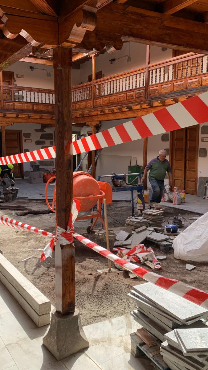 En el interior, además de pintar, se están eliminando las humedades y desperfectos, tratando la carpintería y sustituyendo las ventanas en mal estado. También se han realizado mejoras en las instalaciones de electricidad, fontanería y saneamiento, y la eliminación de barreras arquitectónicas, adaptando el aseo y las instalaciones a las personas con movilidad reducida.