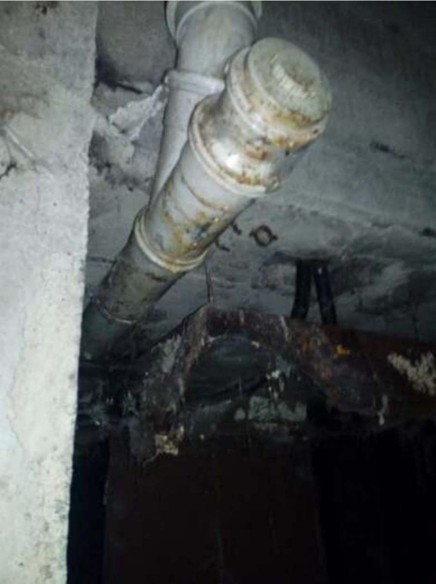 La tubería general de saneamiento que viene desde el bloque aledaño, el número 36, se ha quebrado y el caudal de aguas fecales cae directamente en una zona muerta bajo los dos edificios. Lo que además del consiguiente riesgo sanitario supone un peligro para la integridad de las estructuras de ambas construcciones.