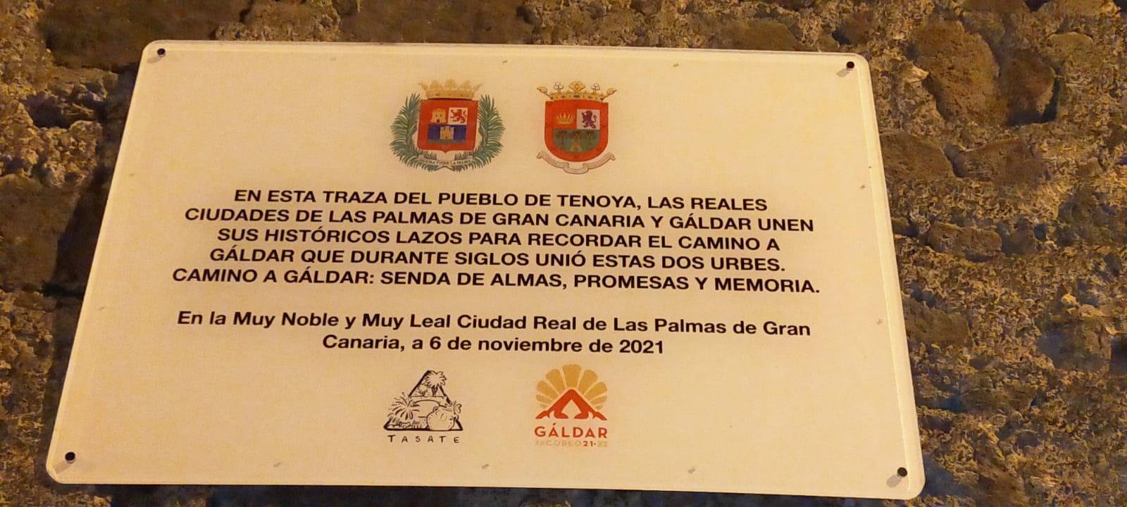 En la noche del pasado sábado, el pueblo de Tenoya acogió los actos de presentación de la Asociación Cultural Tasate, en defensa del patrimonio de Tamaraceite, San Lorenzo y Tenoya. El acto comenzó con la lectura de un poema del escritor Daniel Martín, cuyos versos invitaron a los asistentes al descubrimiento de una lauda conmemorativa en recuerdo al Camino a Gáldar, que dice así: “En esta traza del pueblo de Tenoya, las reales ciudades de Las Palmas de Gran Canaria y Gáldar unen sus históricos lazos para recordar el camino a Gáldar que durante siglos unió estas dos urbes. Camino a Gáldar: senda de almas, promesas y memoria”.