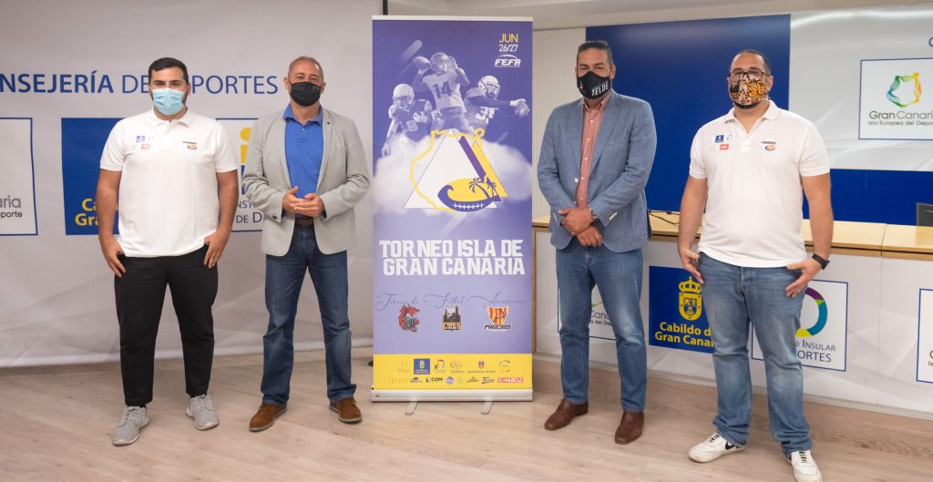 El consejero de Deportes del Cabildo de Gran Canaria, Francisco Castellano, acompañado por el concejal de Deportes del Ayuntamiento de Telde, Diego Ojeda, presentaron el primer torneo nacional ‘Isla de Gran Canaria’ de fútbol americano, que se juega el 26 y 27 de junio en el campo de fútbol de Ojos de Garza, en Telde.