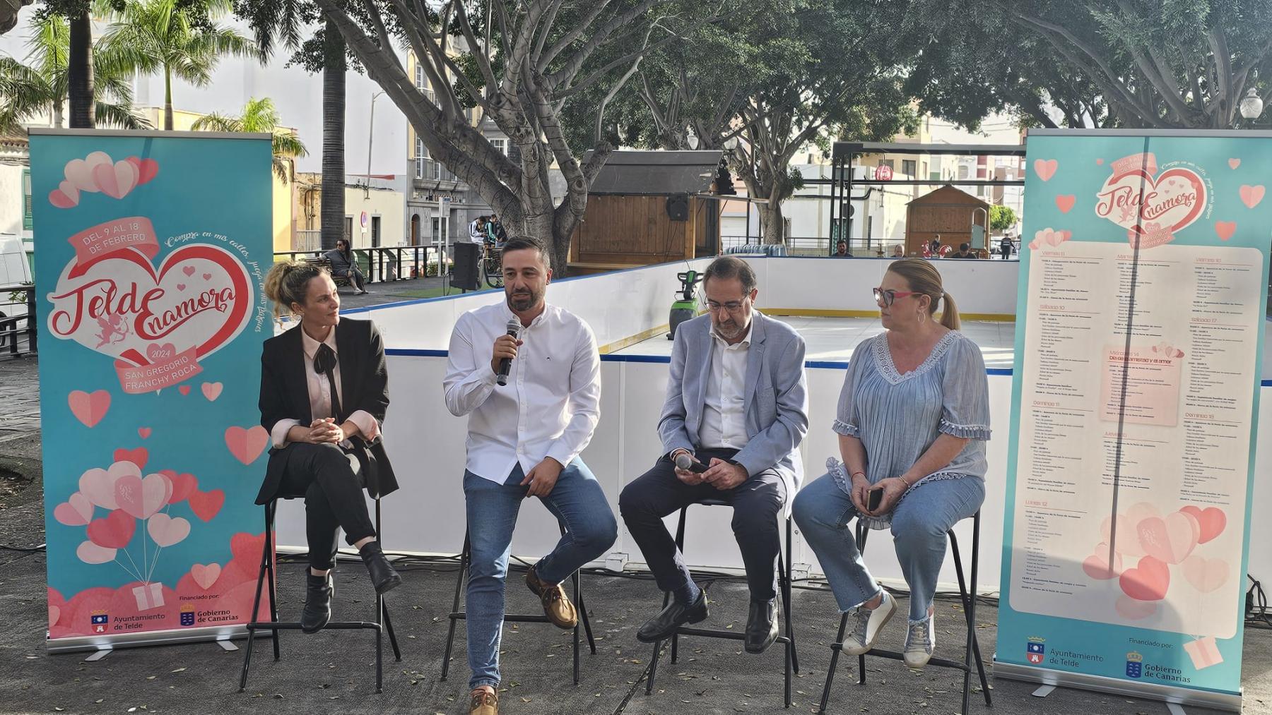 El parque Franchy Roca, en San Gregorio, será este año el gran protagonista donde celebrar el día del amor y de la amistad en la ciudad. La Concejalía de Desarrollo Local, que lidera Nayra Navarro, ha dado vida a Tede enamora, un programa repleto de actividades, talleres, espectáculos y sorpresas para todas los públicos, que se presentó en la tarde de hoy miércoles con la presencia del alcalde, Juan Antonio Peña, la edil del área, el viceconsejero de Industria, Comercio y Consumo del Gobierno de Canarias, Felipe Afonso, y la presidenta de la Zona Comercial, Natividad Suárez. Como detalles a destacar, habrá una pista de 200 metros cuadrados de patinaje sobre hielo artificial en la misma plaza, para todas las edades, y un tren familiar que recorrerá San Gregorio.
