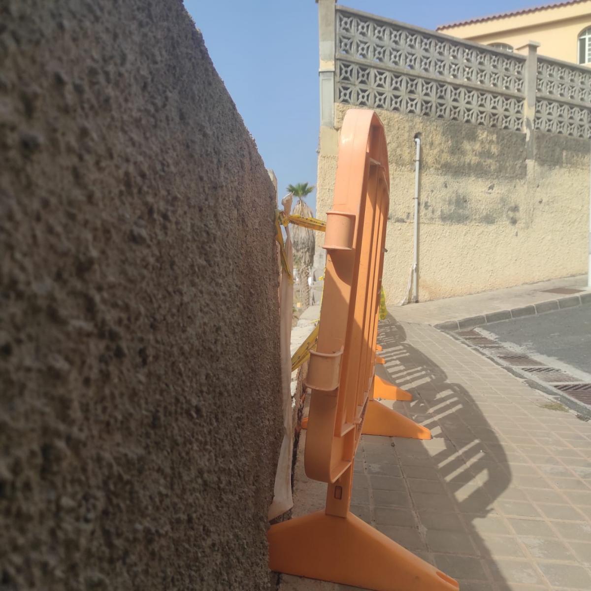 Un muro se ha desprendido en la calle Mastranto de Hoya del Pozo (Telde) y solo unas vallas plásticas que el viento puede arrastrar en cualquier momento protegen la caída de cualquier transeúnte de una altura considerable de más de doce metros. Los vecinos solicitan la pronta reparación del mismo para evitar una desgracia.